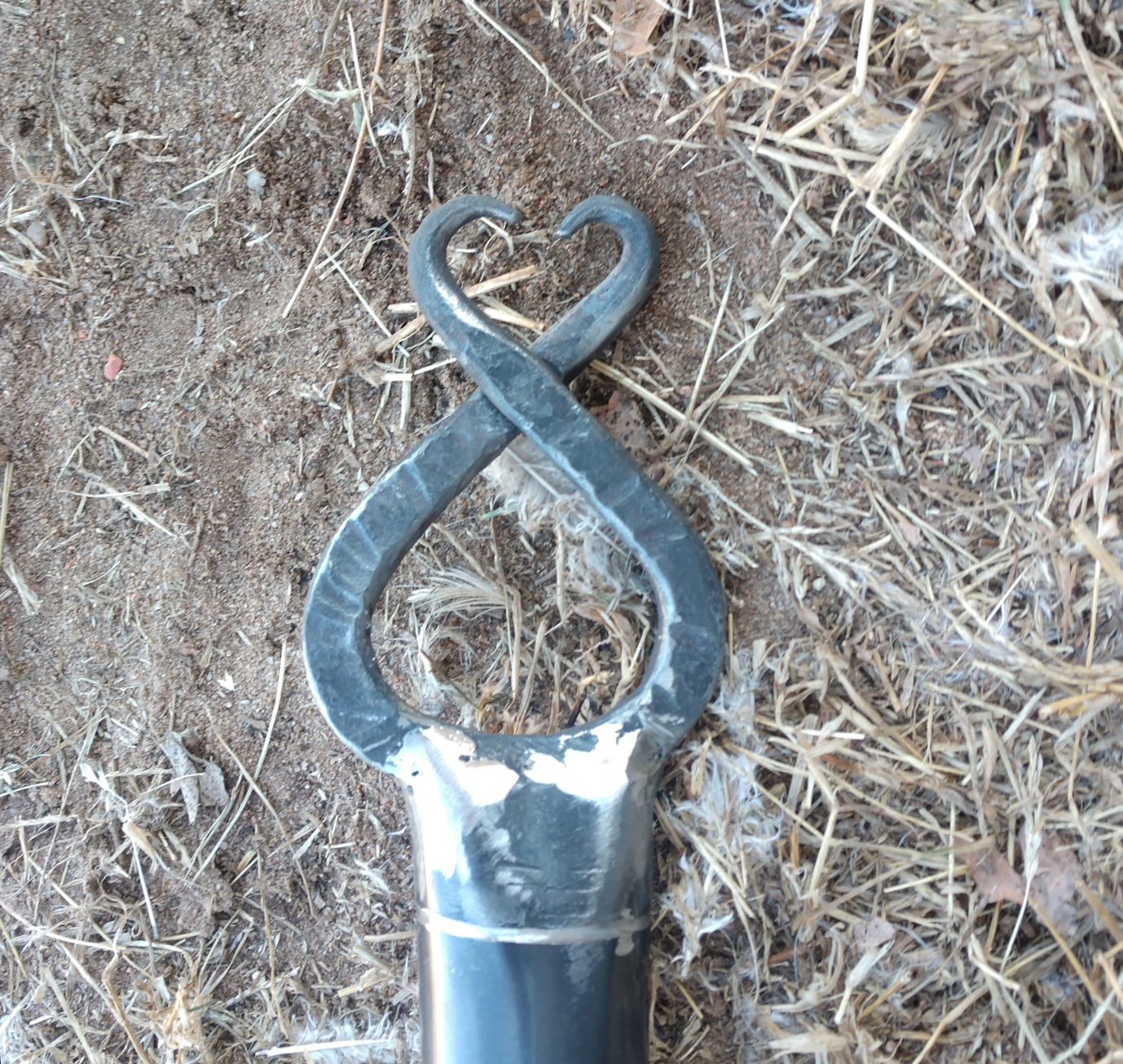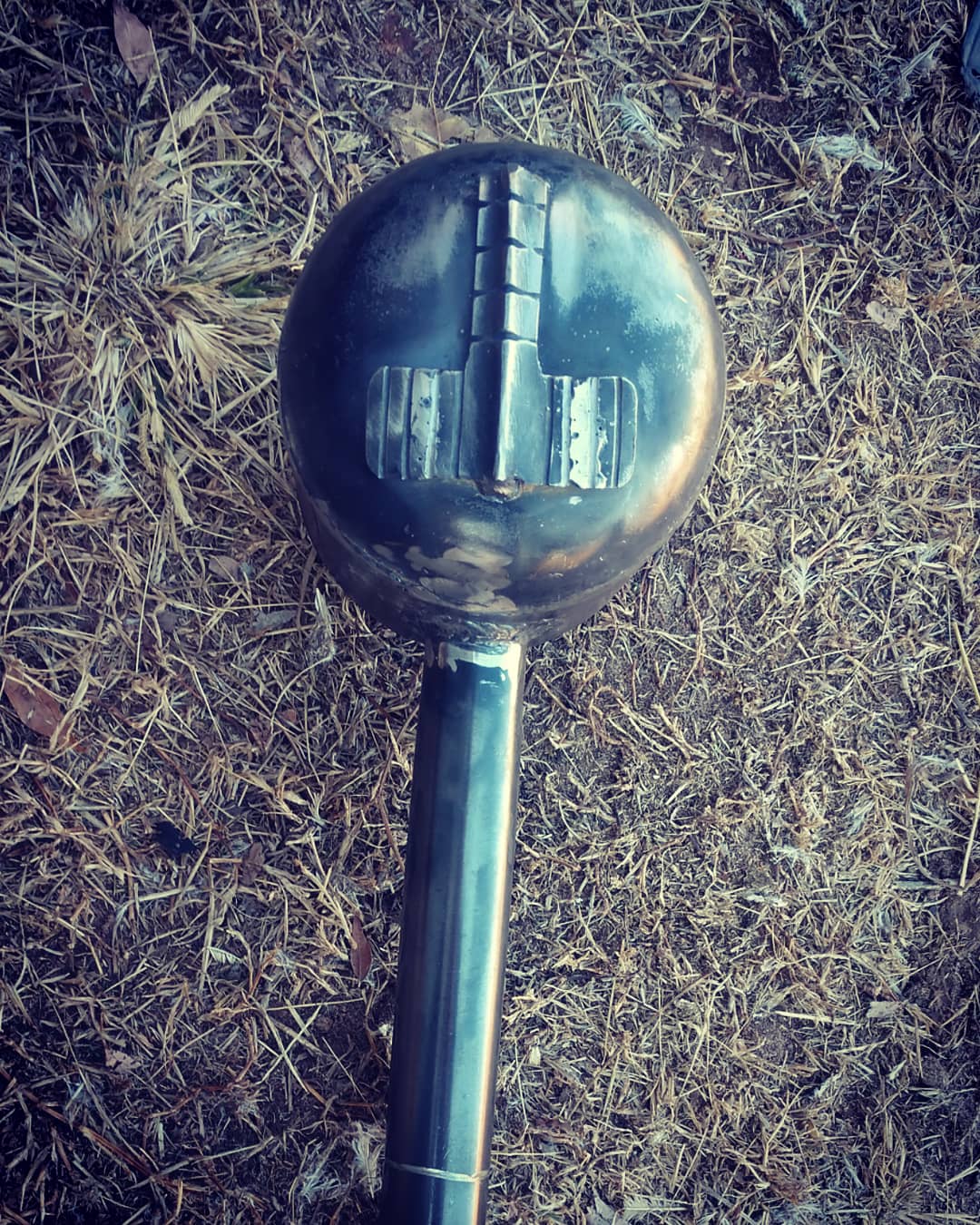 The pommel on the end of the handle is a forged troll cross and it has two custom Thors hammers on the end caps of the hammer head!